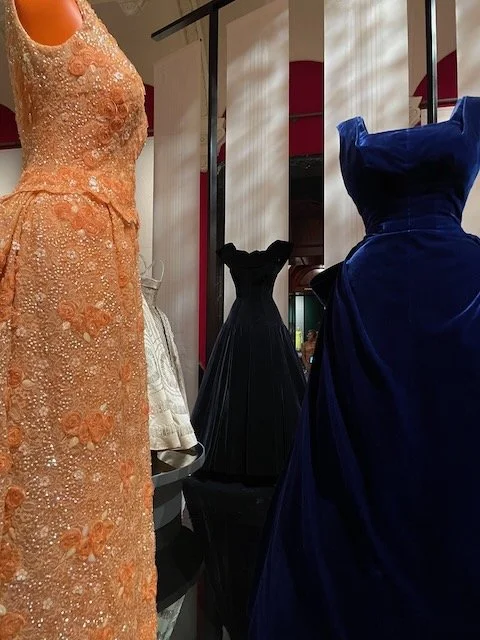 Something rare and unique about the exhibition is that where appropriate, it includes the pearl and diamond necklaces, earrings and tiara that the Queen wore with a particular dress. It’s amazing to see these priceless jewels alongside the clothes. I’ve often heard about the effect of meeting her when she was dressed in all her sparkles, but I didn’t think I’d get to see it for myself. Many women get to wear the same quality of couture in their lives, but very few have, or had, access to the same accessories.