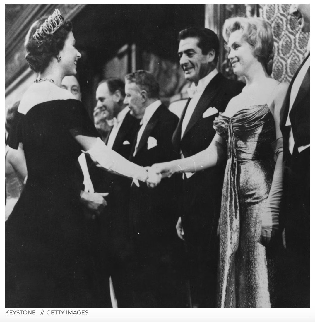 I love the picture of these two women of almost the same age – in their mid-thirties – meeting each other for the only time. Of the two, it’s the Queen who looks more confident. Marilyn apparently chewed off all her lipstick with nerves beforehand, not that she needed to worry. She was living on the Windsor estate at the time while she filmed The Prince and the Showgirl with Lawrence Olivier, and hoped to meet Elizabeth again, but they were both too busy for that to happen. What a shame. If they’d had the chance, they’d have had so much shared experience of being looked at and objectified to talk about. As it is, that one brief meeting gets a mention in A Death in Diamonds, set the following year.